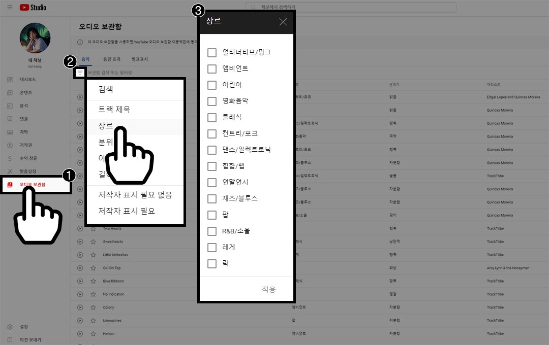 STEP 1. 오디오 보관함을 클릭합니다. 유튜브에서 제공하는 무료 음악들을 모두 보실 수 있습니다.