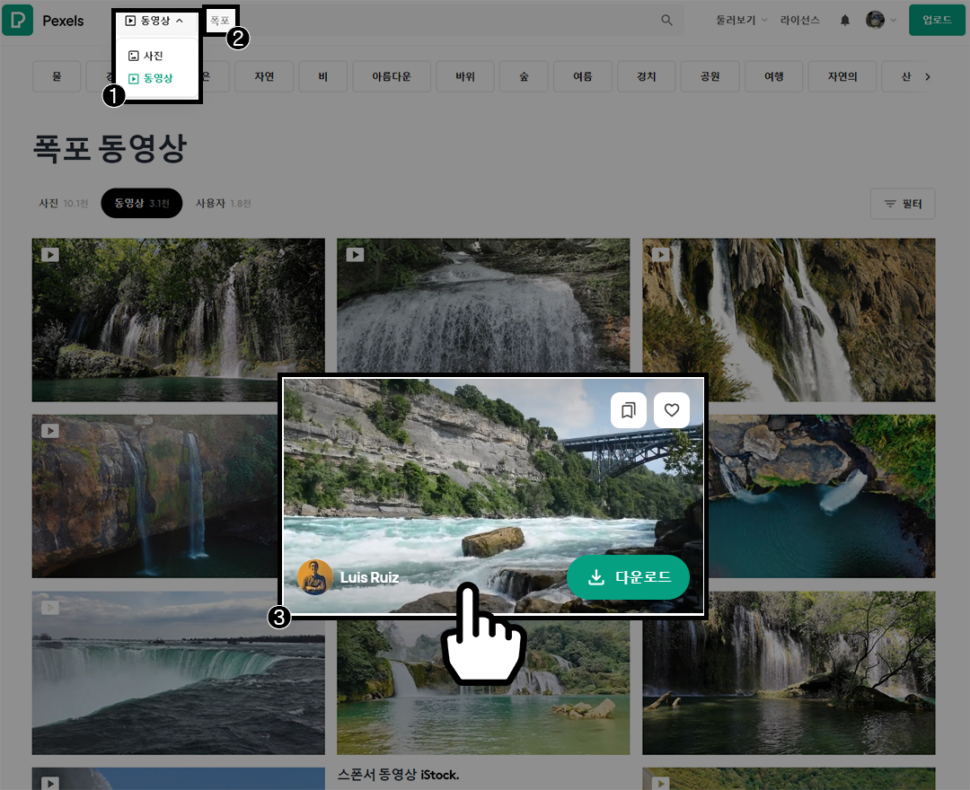STEP 3. 폭포 동영상을 검색했는데 폭포와 관련된 영상들이 쫙 나옵니다. 마우스를 썸네일에 올리시면 동영상이 바로 재생되는 걸 보실 수 있어요. 마음에 드신다면 다운로드 버튼을 눌러 다운로드하시면 됩니다. 리스트 상단에 폭포와 비슷한 검색어를 보여주기 때문에 다른 걸 검색하기도 쉬워요.