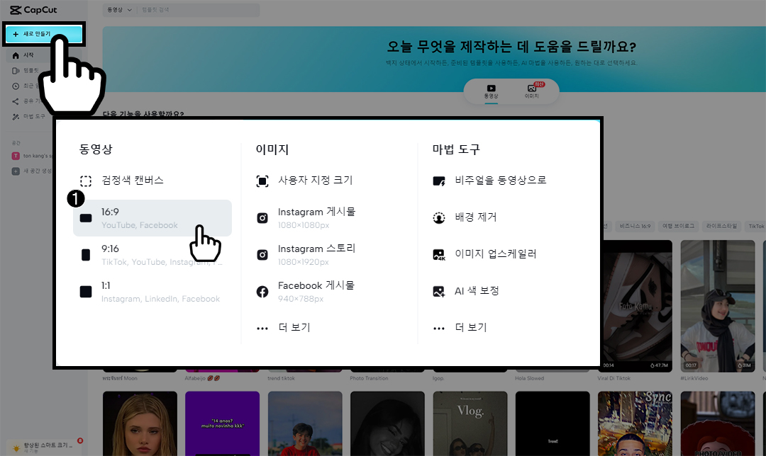 STEP 1. 유튜브에 올릴 영상이니 동영상 부분에서 사이즈를 16:9로 선택해 줍니다.