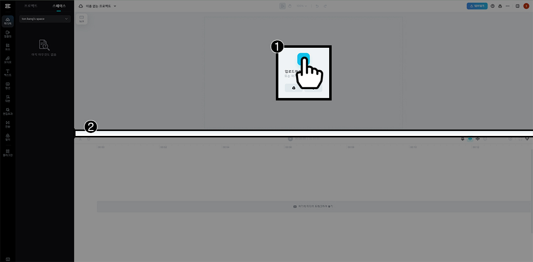 STEP 2. 아래 캡처 이미지에서 2번 부분을 자세히 보시면 라인이 하나 있는데요. 거기에 마우스를 잘 갖다 대시면 높이를 바꿀 수 있도록 마우스포인터가 변하는 것을 알 수 있습니다. 편집을 원활하게 하기 위해서는 해당 부분을 최대한 위로 올리셔서 편집창을 넓게 쓰실 수 있도록 권장해 드려요. STEP 1번 부분은 동영상 미리 보기 부분이라서 화면이 크지 않아도 불편함이 없거든요.