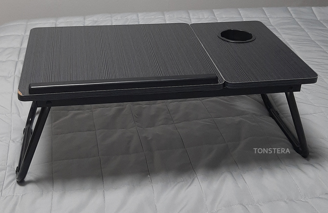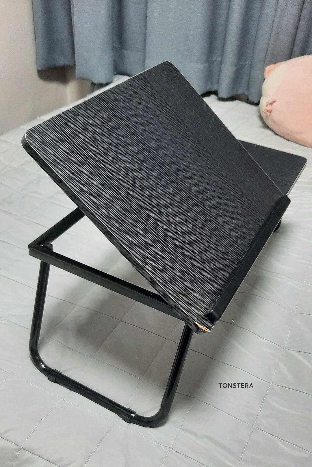 밑에 다리 두 개는 접을 수 있는 거거든요? 저 두 개의 다리를 접으면 책상에서도 노트북을 필요에 따라 세워서 쓸 수 있을 거 같기도 하더라고요. 다리는 모서리가 다 둥글어서 침대에 영향을 주지 않았습니다.