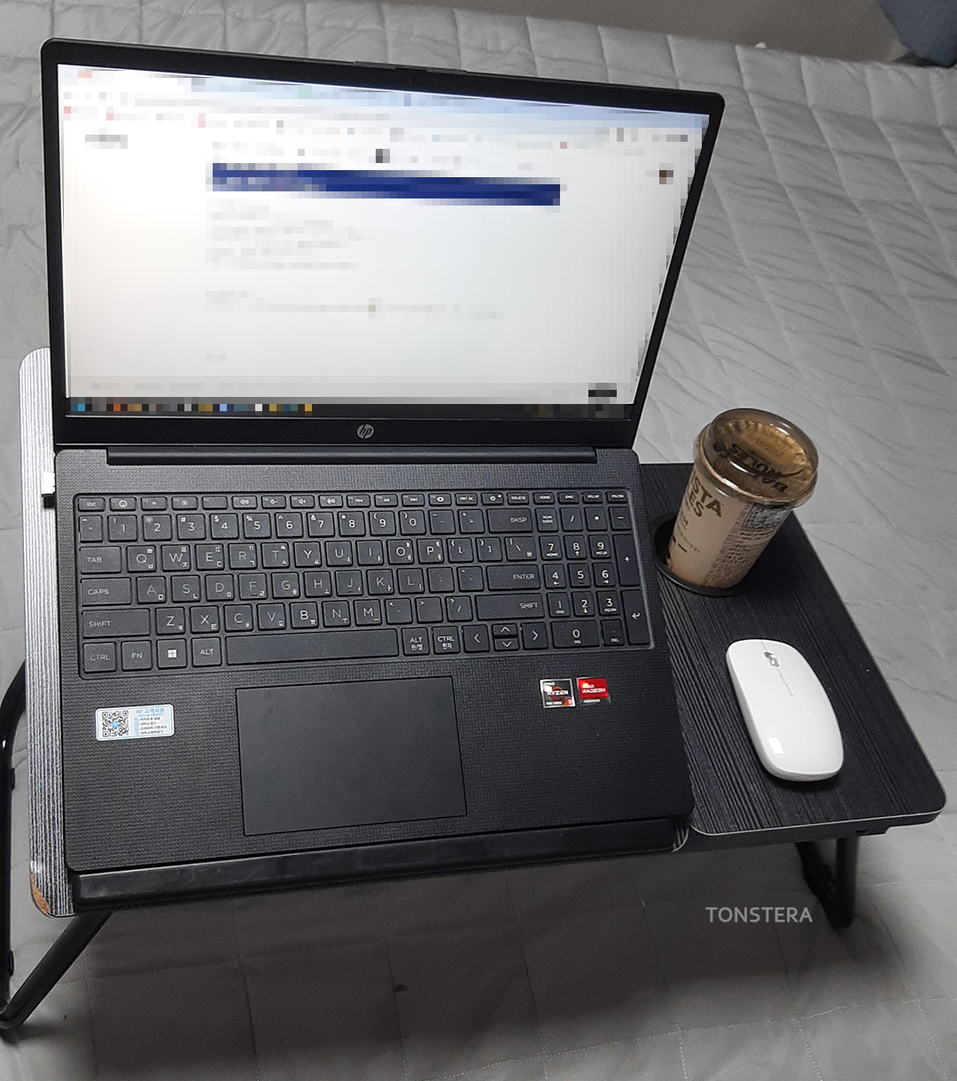 아 뜯겨나간 부분이 상당히 거슬리죠 ㅎㅎ 여러분 뜯을 때 조심히 뜯으시길 바라요. 그리고 택배분들도 조금만 조심히 다뤄주시면 좋을 듯.. 많이 튼튼해 보이진 않았거든요. 아무튼 전반적인 느낌은.. 생각보다 가볍다! 생각보다 작아서 어디 두기는 좋다! 침대에서 쿠션에 기대어하기 상당히 편하다! 블로그질에 빠질 수 없는 센스 있는 커피 자리까지! 가격대비 저는 만족하고 쓸려고 합니다. 막 노트북도 쓰고 태블릿도 쓰고 이런 분들한테는 불편할 거 같네요~ 이상 내돈내산 홈앤하트 AB 접이식 각도조절 노트북 베드트레이 후기였습니당