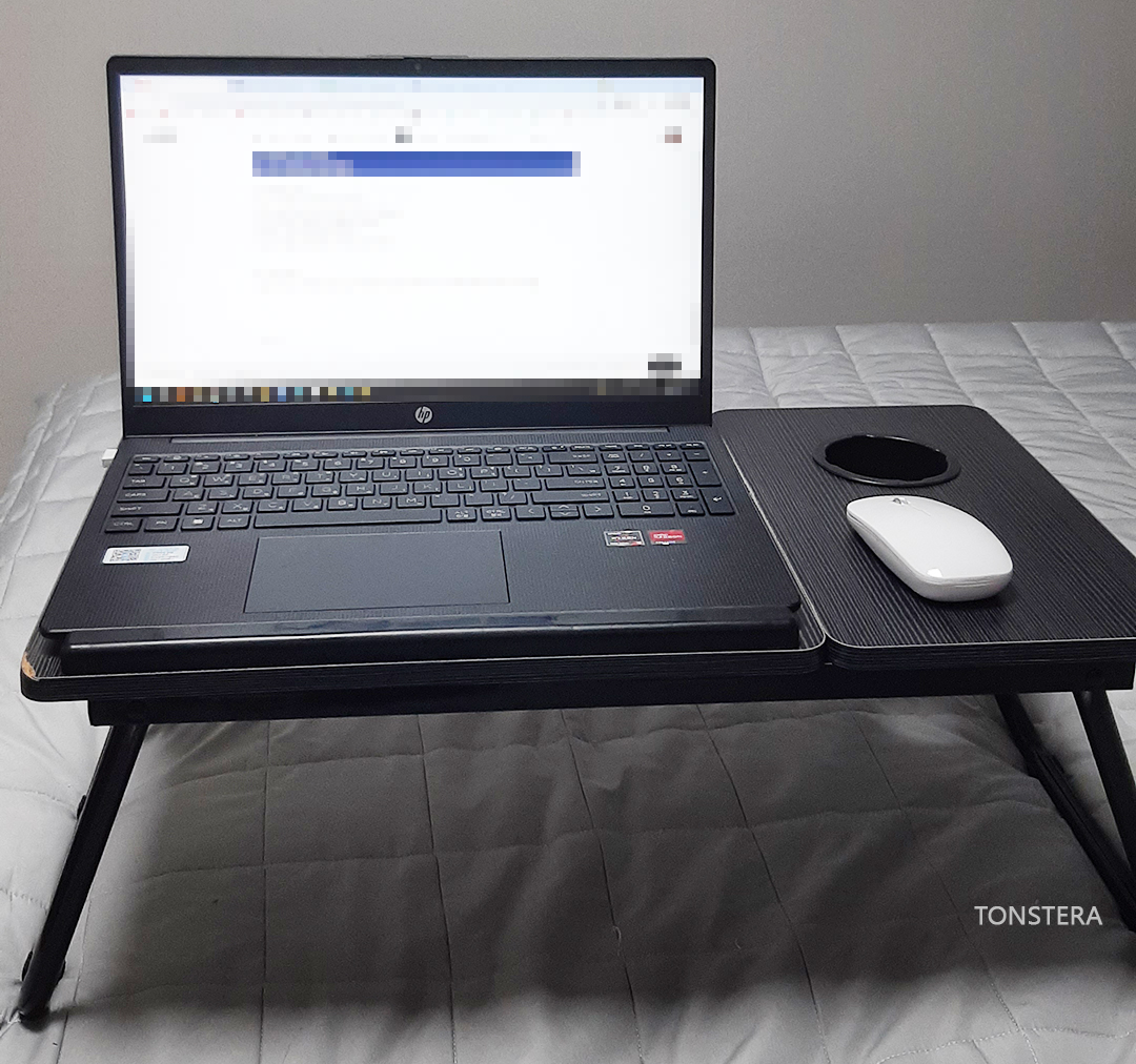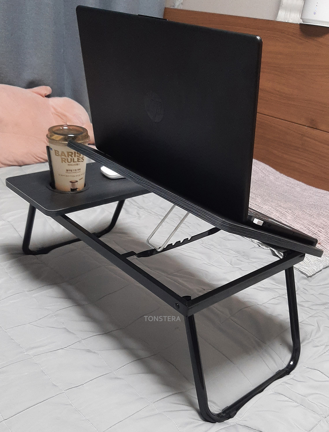 그래도 무겁지 않으니 침대 매트리스엔 영향을 주지 않을 거 같았어요. 좌측엔 노트북, 우측엔 마우스 그리고 커피나 물을 둘 수 있는 공간이 있어서 흔들려도 안심은 될 꺼 같아요 ㅎㅎ